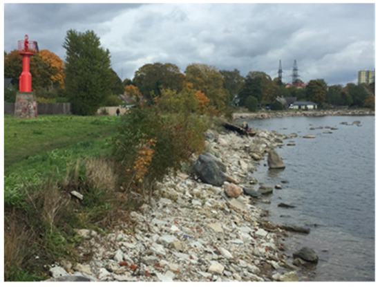 - Low cliff/steep slope. This area comprises a steep slope and near-cliff with rocks and some old concrete remains from industrial use of the area during Soviet times and a somewhat broken slipway (Figure 2). This uneven and steep slope makes access to the water difficult so that dealing with the change in level and allowing different degrees of access to water was a key aspect of each design option.