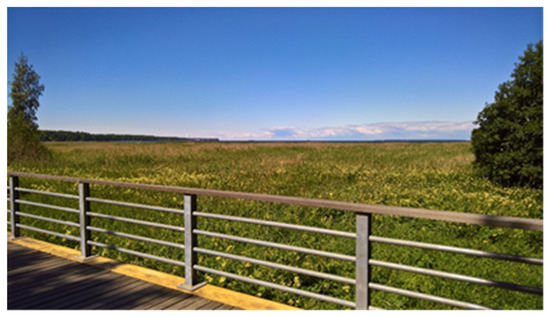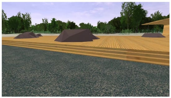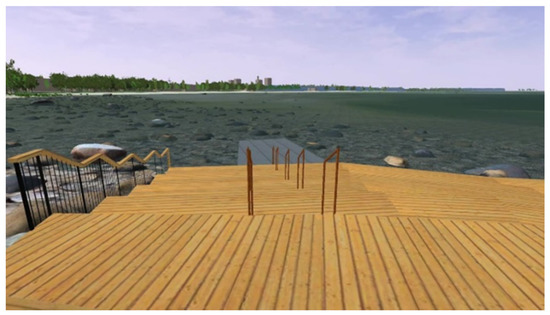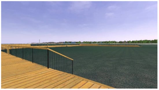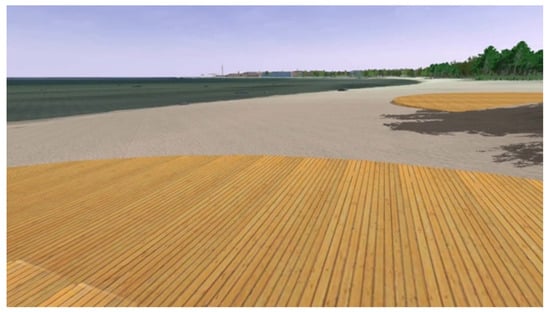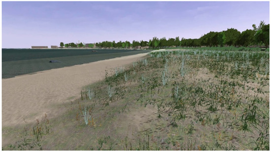 The three-dimensional model of the landscape for the virtual intervention testing was based on a section of the real landscape at Kopli in Tallinn, Estonia. The commercial software package LandSim3D (Bionatics s.a., Paris, France) was used to create the simulation. The software uses various GIS (geographic information system) layers to generate a parametric landscape model automatically that can be further enhanced with specific 3D models of components (specific 3D models of the intervention designs in our case). Figure 6 shows a view of the final model with the sea, sand dunes, forest and buildings in the distance. See Supplementary Materials A for a description of the process of creating the model in more detail.