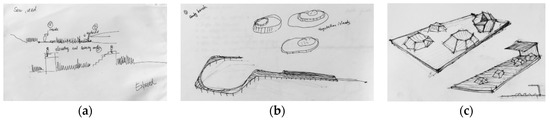 A sample of design development sketches used for the basis of the design solutions: (a) testing viewpoint ideas in an area of tall reeds; (b) developing beach seating and a water access structure; (c) designing a deck with playful structures and a shelter. (Source: Jekaterina Balicka and Umme Aymona Ali Amrita).