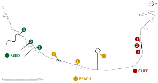 - We selected a landscape which was diverse enough to represent different shoreline types and divided it into three zones—a low but steeply sloping/cliff area, a sandy beach and a reed-fringed shore, representing different potentials and limitations of contact with water typical of the Baltic Sea.