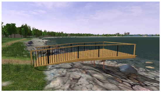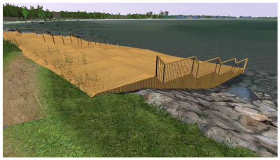 The intervention was designed as a spacious, comfortable area to spend time and relax next to the water, as well as have an opportunity to touch the water (Figure 10). Inspiration for this intervention came from the following projects: Oriental Bay, Wellington, New Zealand (Johns 2007 [70]); Alsion University campus, Denmark (Schonherr Landscape Architects 2016 [71]). Depending on the water level, the concrete platform on the lower part may be covered with 5–20 cm of water. The area provides options for resting and comfortable seats for people whether alone, in couples, or in small to middle-size groups. Depending on the user’s choice, it could be an area to socialize or contemplate while having a wide view of the water. In contrast to option 2, this platform is smaller and less likely to attract large numbers of people. The structure is made in a similar way to Option 2 with a concrete platform to withstand winter ice damage.