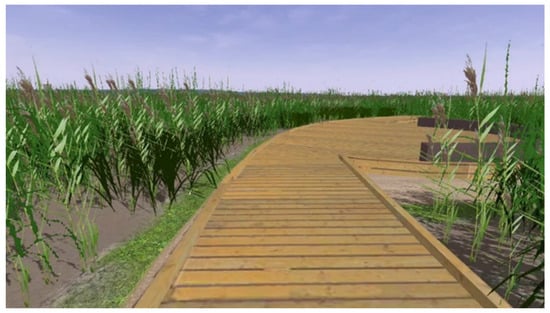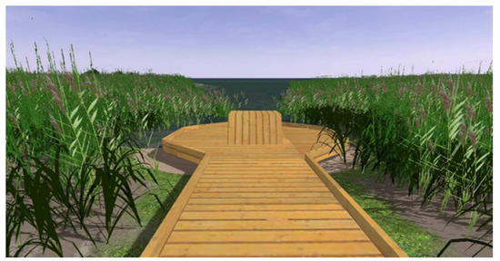 The intervention consists of a long wooden deck path which leads through the reed area. At the end of the deck, there is an accessible elevated platform, providing a wide view over the sea (without direct contact with the water) (Figure 14). Inspiration for this intervention came from the following projects: Tagus linear park, Portugal (Topiaris Landscape Architecture 2014 [76]); Houtan park Shanghai, China (Turenscape 2011 [77]). The platform at the end of the deck provides a climax of the experience, the surprising view opening to the visitors in the area, where no view is otherwise possible. It has mesh safety rails all along the length.