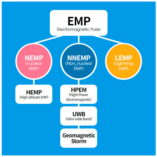 An instance of EMP-based military dangers was a nuclear explosion test with an explosive yield of 1.4 megatons conducted by the US 400 km above Johnston Island in the Pacific Ocean in 1962; this explosion knocked off the street and traffic lights and caused malfunctioning of the communication equipment in Honolulu, Hawaii, which was approximately 1400 km away from the test site. In July 1967, a missile mounted on a F-4 fighter on a USS Forrestal-class aircraft carrier, which was engaged in duty in the Vietnam War, was launched by an EM interference, causing 134 deaths and damage worth $75 million. Furthermore, during the Falkland War between the UK and Argentina in 1982, the UK battleships and Argentine fighters used radars of the same EM band. Consequently, continuous malfunctions occurred in the UK battleships, and an Argentine fighter failed to understand that there was a radar malfunction and crashed unprotected without taking any action. In 1980–1990, a UH-60 Blackhawk helicopter of the US Army crashed owing to the random activation of the safety device, and the investigation results revealed that the safety system had been exposed to a high-power EMP. Several similar helicopter crashes occurred subsequently, and the cause was always identified as a defect in the helicopter. As discussed in these examples, not only the high-altitude electromagnetic pulse (HEMP) caused by nuclear explosions but also the artificially generated high-power EMP have been very dangerous throughout the history of modern wars. Such non-nuclear EMPs (NNEMPs), which are also called high-power microwaves (HPM) or intentional EM interference, can damage electronic devices with a short pulse width, low repetition rate, and an output power ranging from hundreds of MW to several tens of GW. They are usually generated by electronic bombs (e-bombs) and previously appeared as military weapons; however, recently, they have been developed as compact, high-power devices. Products that can cause damage by generating a 350 MHz, attenuated vibration sine waves isotopically with an electric field strength of approximately 120 kv/m at 1 m and continuously activating five pulse waves for 30 min have been commercialized. Despite such threats associated with NNEMP, the present EMP protection measures of the military and national critical facilities are focused only on building protection facilities against HEMP [7,8,9,10]. Furthermore, it is estimated that enormous costs will be required to add the NNEMP protection ability to all the national infrastructures. The present EMP protection technology and test standards in Korea are based on MIL-STD-188-125, which is the EMP protection standard employed by the U.S. but is limited to only HEMP protection [8]. Figure 1 shows the classification of EMPs.
