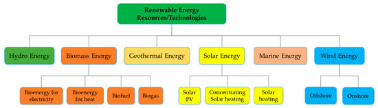 Bangladesh contains a large number of RE sources, which can effectively meet the increasing need for energy. Figure 1 offers a preview of numerous sustainable power supply developments and electricity generation accessible properties in Bangladesh []. In Bangladesh, RE sources include vitality for solar, wind, biomass, geothermal, and hydropower and dismiss conventional nuclear energy out of the equation. It is important to note that Bangladesh is also going to produce nuclear energy to fulfill its huge energy demand and adhere to sustainable developments.