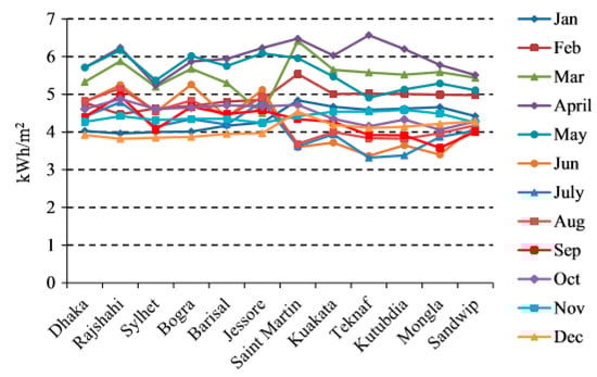 Solar-powered electricity is one of the most fascinating, effective, and unlimited sources of energy that is universally adored and accepted. Concentrating solar power (CSP) and the solar photovoltaic (PV) are prospective developments as a solar-based home system delivers electricity from solar radiation. In Bangladesh, the possibilities for the use of solar radiation are enormous since it is located in the topographical zone []. In the daytime, she receives typical sun-oriented radiation of 4–6.5 kWh/m2 which can produce around 1018 J. Month by month sun-based radiation from some selected locations of the country is shown in Figure 2.