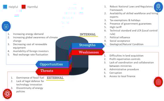 For energy researchers, the SWOT analytical tool is generally recognized as an effective method to understand the overall scenario of a country’s energy industry. For instance, to test Nigeria’s nuclear exploration agenda, Ishola et al. [] resorted to SWOT as an instrument. Kamran et al. [] also used SWOT to analyze Pakistan’s RE sector. Besides, an exhaustive evaluation was performed using the SWOT analytical method in the light of the possible developments of green energy technology in the East Asian economies; namely, Taiwan, Japan, and South Korea []. Research using SWOT analysis has also been carried out to test solar PV power in Africa as opposed to China []. SWOT analyses were also used in another study to test Macedonia’s national energy sector []. A SWOT review was performed to draw investors in the Tunisian RE market to infer the main issues and considerations to assist the sector to grow []. Very recently, a SWOT analysis was performed to understand the policymaking of nuclear energy generation in Ghana [].