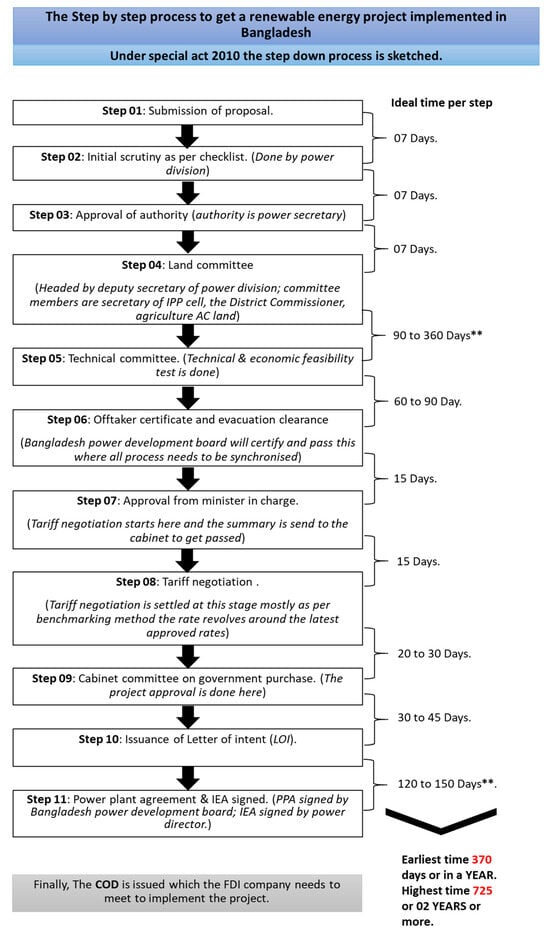 Political risk is probably the most common decision-making determinant that is checked by any foreign investment firm while investing in the power sector. Past literature shows that in different countries, power projects were subjected to political risks during the change of governments. However, our expert opinion has confirmed that Bangladesh is immune to this common weakness since there was not a single case where the new government either closed or renegotiate the terms and conditions with the FDI power projects []. Hence, renewable power plants that are implemented via direct negotiations have been indemnified by the law, and therefore, are not subject to any renegotiations. This gives good confidence to foreign investors.