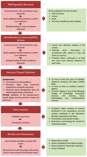 This paper is structured as follows: Section 2 presents a review of the literature, mainly addressing the drivers identified in the bibliographic research. Section 3 presents the procedures used to carry out the bibliographic research, identification of smart mobility drivers, survey of expert opinions and the data analysis. Section 3 presents and discusses the research results. Conclusions are provided in Section 5.