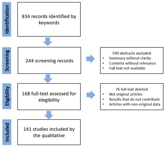 Initially, we performed an exploratory reading considering the most relevant titles, abstracts, and keywords to select the studies that were adherent to the theme of this work. As a result, of the 834 articles identified, we discarded 590 articles whose abstracts were not relevant to the topic researched, were not peer-reviewed, or were not available in their entirety for reading. Then, we carried out selective reading in the remaining 244 articles to check if this perception of the abstracts was correct and if they were articles relevant to the topic. As a result, we excluded 76 articles that were not original, whose results did not contribute to the theme, and whose results were not supported by the methodology.
