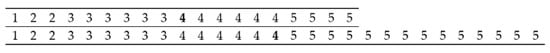 The concept of the relative median considers the distance from the median to the nearest class. As an example, in Figure 3, the median value of four in the first line is much closer to the frequency represented by the number three. In the second row, the median is shifted to the right as we add more cells to the frequency defined by the number five. Although the two lines have medians equal to four, the second line driver can be interpreted as more important since it received more ratings like five and maintained the other frequencies.