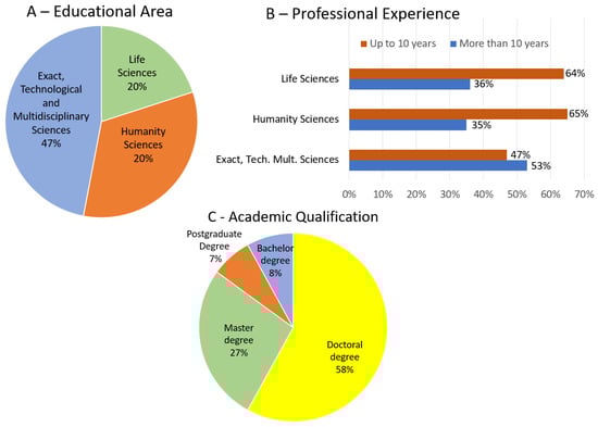 Demographic data; (A) Educational Area; (B) Professional experience; (C) Academic Qualifications.