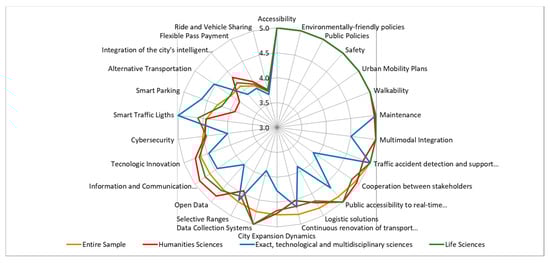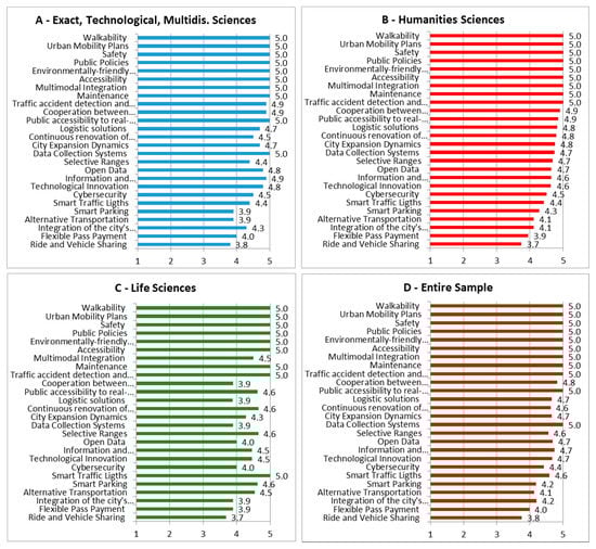 Figure 6 shows the drivers’ relative behavior for the three College of Knowledges and the entire sample. It is possible to notice that the College of Knowledge of Exact, Technological and Multidisciplinary Sciences presents a different results pattern. The median found for most drivers that are not considered “extremely important” for mobility intelligence was lower than the other areas. Drivers such as Multimodal Integration, Cooperation Between Stakeholders, Logistic Solutions, Data Collection, Cybersecurity, and Information and Communication Technology received an evaluation well below that of the other College of Knowledges, in contrast to the evaluation trend observed in others.