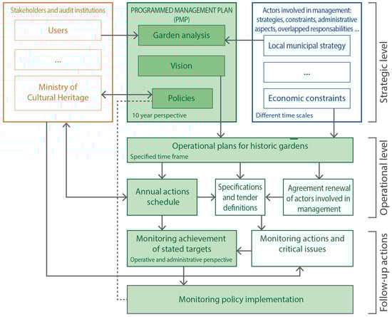 Flow chart of the decisional and operational aspects of the management of a historic garden, elaborated from Cazzani, Zerbi and Brumana (2019) [], p. 295.