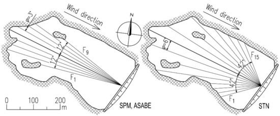 However, the U.S Army Corps of Engineers presented a simplified procedure in SPM fundamentally linked to Saville’s method [15]. The effective fetch is expected in the direction of ±12° from the middle ray plotted in the direction of the main effect of the wind. The resulting fetch length F is the arithmetic average of 9 ray lengths Fi, plotted by φ = 3° from the middle ray (Figure 3). The method is also used in calculations by the ASABE investigating the wind conditions on reservoirs: