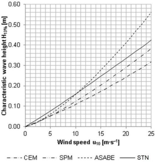 The prediction of the characteristic wave height H13% was performed by four models (CEM, SPM, ASABE, STN) based on the selected wind speed at the point of analysis. The lowest values of wave height were calculated by the CEM model—0.32 m. In contrast, the highest values of the wave height with the same wind speed are gained using the ASABE model—0.56 m. The estimates of the STN and SPM reach 0.42 m and 0.38 m, respectively (Figure 4).