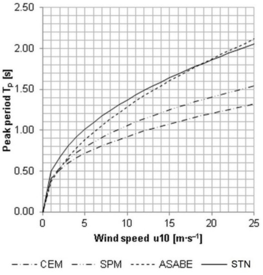 Similar results of wave periods to wave heights were achieved. The CEM model also predict the lowest values of estimated wave period (1.32 s), and the ASABE model (2.11 s) the highest one. Correlation of results by ASABE and STN model is higher than in case of wave heights, and their values have a similar trend (Figure 5). The prediction of the wave period according to the STN is the highest up to the wind speed of 18 m·s−1. The resulting maximum periods of around 2 s correspond to the results of a former study of the gravitational oscillating waves on dams and reservoirs, based on which Lukáč and Abaffy [18] stated that a wave period of 5 s at maximum can be expected in Central European dams of usual dimensions.