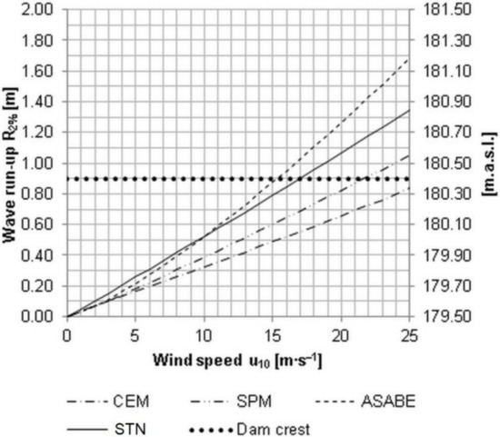 Elevation point 179.50 m a.s.l. corresponds to the still water level in the reservoir (SWL) and the dam crest is at 180.40 m a.s.l. The highest estimates of wave run-up are predicted by the ASABE model, within which the theoretical wave run-up at the maximum wind speed reached the value of R2% = 1.68 m, followed by the STN model with the value of 1.35 m, SPM 1.05 m and CEM 0.84 m, respectively (Figure 6). Since the SWL in the reservoir is only 0.90 m below the dam crest, the dam overtopping by wind-driven waves can be expected from the critical wind speed, which will cause wave run-up R2% > 0.90 m. This critical wind speed is 27 m·s−1 in the case of the CEM model, 22 m·s−1 in the case of the SPM model, and only 15 m·s−1 in the case of the ASABE model.
