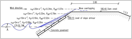 Based on the current knowledge and research results in the field of wave mechanics and the stabilization of dams [8,22], the wave run-up of with 2% exceedance probability R2% was selected to verify the overtopping of the dam crest.