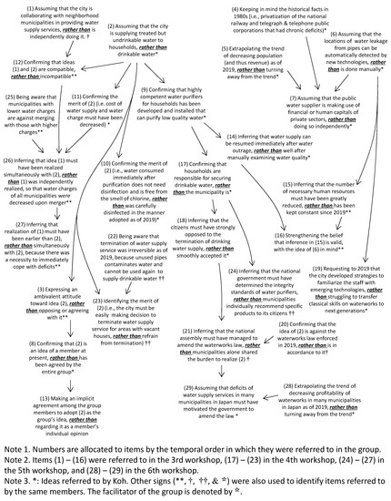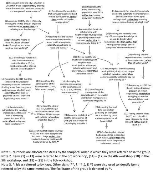 After visualization of the group discussion processes, we extracted commonalities between the two groups with respect to: (i) Characteristics of their idea about water supply management’s reality in 2049 and (ii) characteristics of the group’s discussion process in deriving the idea. Finally, we identified which characteristics of (i) were associated with which characteristics of (ii).