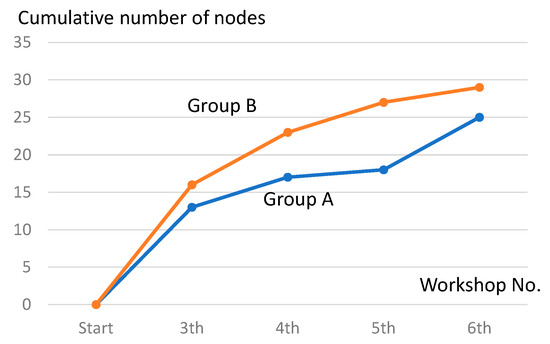Figure 1 and Figure 2 show cognitive mapping of A and B groups’ deliberation processes, respectively. In each map, the numbers indicate nodes according to the temporal order in which the group referred to them, so that the cumulative numbers of nodes increased according to the increased number of workshops (Figure 3).