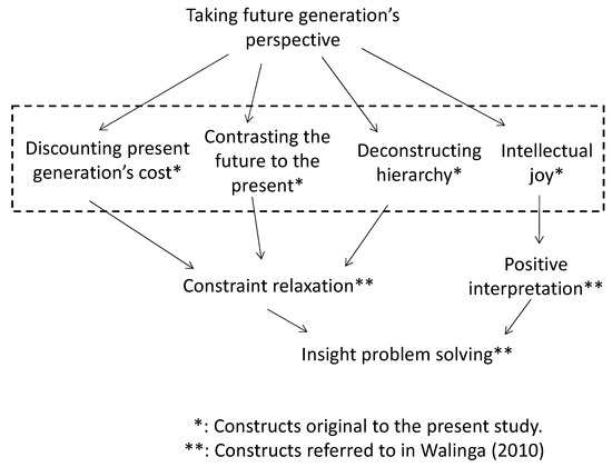 Two things should be noted about this conceptual framework. The first is the mediator (a) discounting the present generation’s cost. As mentioned in the Introduction, the role of creativity or insight in attaining sustainability has attracted a great deal of scholarly attention [7,10,11,12]. Few studies, however, have explicitly discussed the mechanisms by which sustainability is secured in reframing and devising creative solutions obtained from procedures proposed in the general literature of creative problem solving (CPS) or insight problem solving (IPS). This is problematic because, in general, procedures for creativity or insight can produce creative solutions that are beneficial for the present rather than the future generation, especially considering the tradeoffs between present and future generations [41,42,43,44], since the present generation must share the burden when implementing a solution. This provides strong evidence that taking the future generation’s perspective is a promising strategy for sustainable problem-solving or sustainable insight problem-solving.