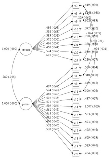 These results yielded a scale made up of 20 variables distributed in two factors, F1 Personalidad Resistente (Tough Personality) (PerRes), and F2 Recursos y Control (Resources and Control) (RecCon). A further rotation was carried out and the EFA results explained 48% of the total variance of the two factors. The Goodness of Fit Index (GFI) obtained a value of 0.98, and the root mean square residual (RMSR) obtained a value of 0.058, showing a good fit to the bidimensional structure of the scale [47]. Both Bartlett’s statistic (= 3589.1, df = 190, p = 0.000010) and the Kaiser–Meyer–Olkin (KMO) test (= 0.91) indicated a good fit to the data, and a variance percentage of 0.49 (see Table 2).