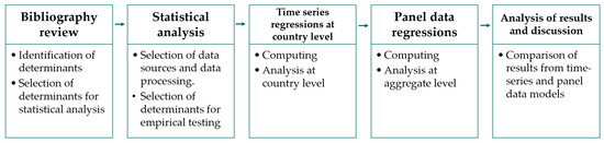 We followed the methodological steps illustrated in Figure 2. First, we carried out an exhaustive bibliography review for identifying the determinants of GHG emissions. Based on this review, we selected a set of variables for making a preliminary analysis of the data to avoid multicollinearity and non-stationarity problems, among others.
