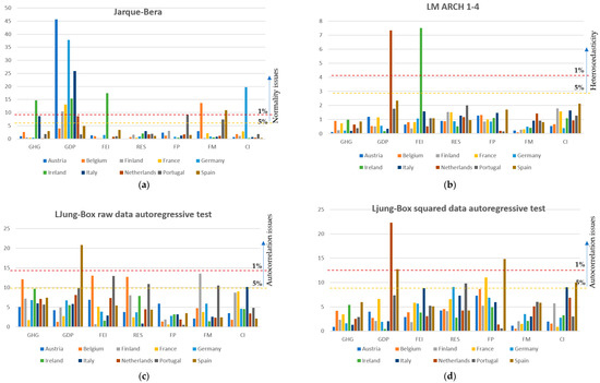 The Jarque–Bera test results suggest the normality of the time series for all variables except for GDP, which is not normal for six out of ten countries analyzed. In the results of the ARCH test, we found evidence of conditional heteroscedasticity for GDP (Netherlands) and FEI (Ireland). Using the Ljung–Box tests, we found autocorrelation in levels for GHG (Ireland and Belgium), GDP (Portugal and Spain), FEI (Portugal), RES (Portugal and Belgium), FM (Portugal and Finland) and CI (Italy), and autocorrelation in squares for GDP (Spain and the Netherlands), RES (Portugal), FP (France and Spain) and CI (Spain).