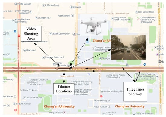 The fast road of the South Second Ring Road of Xi’an was selected as the location of traffic video collection. The headquarters of Chang’an University was chosen as the video recording point. The fast road in the road segment was separate from the vehicles entering and leaving the fast road through the guardrail, and the vehicle lane change caused by vehicle entry or exit was eliminated. The single-lane width wad 3.75 m. Figure 4 is the road simulation diagram. The video was randomly shot from 200 m during the evening peak (17:00–18:00) on a weekday (12 August 2019). Shooting was conducted on a holiday in August, when most students were on vacation; regardless, the holiday only slightly affected the numbers of people driving because only a small proportion of students drove to school when they are not on holiday. The late peak period was the same as that considered in the study by Lijie et al. [21]. A total of 5607 pieces of data for 18 vehicles were extracted using the Tracker software. Figure 1 shows the video shooting area. Table 1 lists 20 sample data, which can provide data support for thesis analysis.