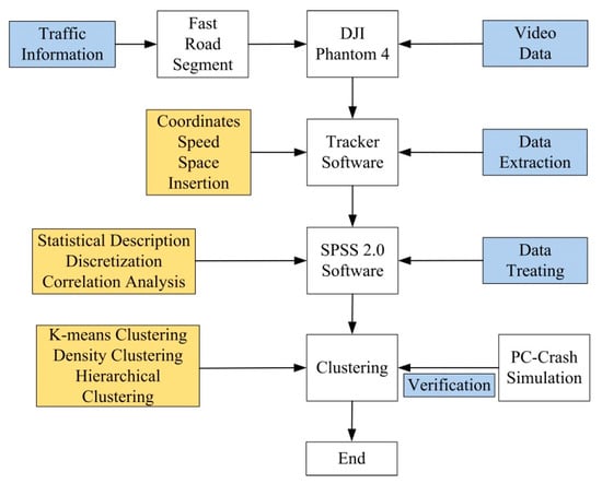 Data extraction: A DJI Phantom 4 drone was used to photograph the road vertically. The Tracker software was used to track the target vehicle, as well as the front and rear vehicles, in the target lane. The software tracked the data according to 1/30 s. Tracker software can provide an automatic and realistic analysis and processing scene [20].