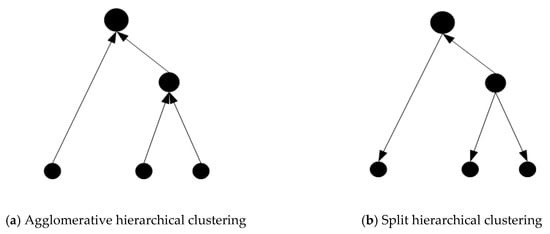 In hierarchical clustering, each sample is first considered as a class. The closest samples are clustered into small classes, which are then combined based on the distance between classes. The process is repeated continuously. Ultimately, all subclasses are aggregated into one large class [26]. Hierarchical clustering organizes data into several groups and forms a corresponding number of groups for classification. Classification is mainly conducted using two methods: the bottom-up aggregation method, illustrated in Figure 3a, and the top-down split method, presented in Figure 3b.