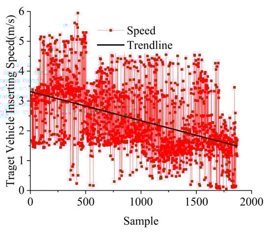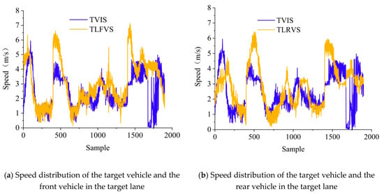 As shown in Figure 6a, when the target vehicle is inserted into the target lane, the change in speed of the target vehicle is similar to that of the front vehicle in the target lane. The difference in speed for 87.9% of the samples is between −2 and 2 m/s.