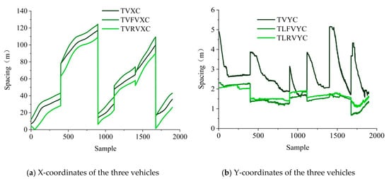 Figure 8a shows that the X-coordinates of the three vehicles exhibit the same trend. When the x-coordinate of the front vehicle in the target lane changes, that the target vehicle and the rear vehicle also change, which conforms to the characteristics of traffic flow propagation. Figure 6 also shows that the target vehicle intersects the front lane trend line of the target lane because the target vehicle accelerates before the lane change; in addition, the vehicle behind the left or right rearward vehicle becomes the preceding vehicle.