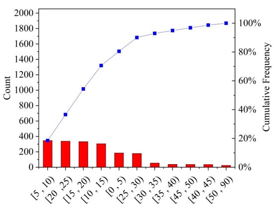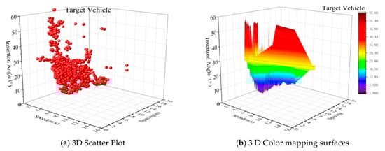 The insertion angle of the lane-changing target vehicle is related to the characteristics of the driver, the running speed of the vehicle, and the insertion distance of the target lane. This study only considers the characteristics of the target vehicle, as well as the characteristics of front and rear vehicles in the target lane. Figure 9 presents the results of the analysis of the acquired samples: the smallest insertion angle is 1.98°, the maximum insertion angle is 56.81°, and the number of samples with an insertion angle below 30° comprises 90.05% of the total sample.