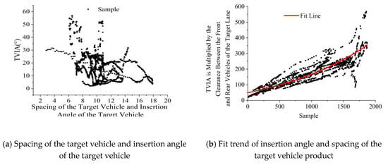The insertion angle of the target vehicle is related to the distance between the front and rear vehicles in the target lane. It is difficult to find the regularity by statistically describing the insertion angle of the target vehicle and the distance between the front and rear vehicles in the target lane. Figure 10a shows the distribution of the insertion angle of the target vehicle, as well as the spacing of the front and rear vehicles in the target lane. To analyze the relationship between the insertion angle of the target vehicle and the spacing in the target lane, the insertion angles of the target vehicle are arranged in ascending order. The insertion angle of the target vehicle is related to the product of the spacing of the front and rear vehicles in the target lane. Figure 10b shows the trend of the fitted curve.