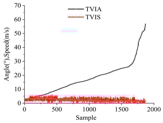 The insertion angle of the target vehicle can reflect the smoothness of the lane change of the target vehicle. Under normal circumstances, the insertion angle of the vehicle is below 5° [8]; however, in the nearly saturated state (saturation degree is 0.85–0.95) in a fast-road segment, the vehicle spacing is smaller than the vehicle spacing in a free-flow state, hence the large angle of vehicle insertion into the target lane. Analysis of the survey sample indicates that the change in speed of the target vehicle is not apparent when the target vehicle is inserted into the target lane at different insertion angles. Figure 11 shows the change in the insertion angle of the target vehicle and its speed.