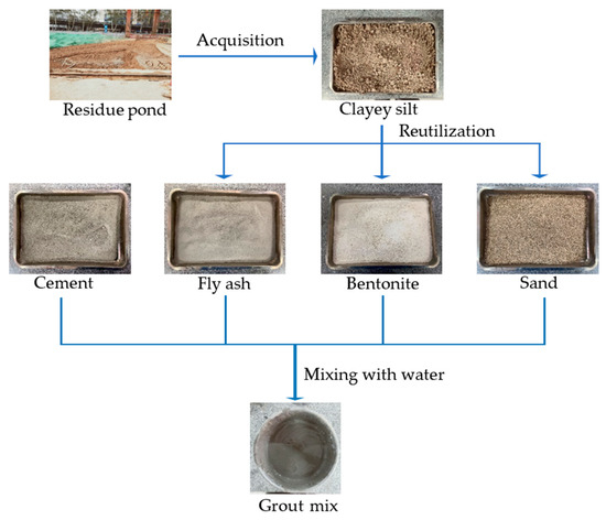 Due to the fast development of city transportation construction, shield tunneling has been extensively used in the development of underground infrastructure [1,2,3]. When tunneling is carried out, the soils are broken up by a shield cutterhead and hauled away by a conveying system along with the process of shield machine advancing. A great deal of excavated soils needs to be transported from construction site to disposal area, which costs a lot of money and pollutes the environment due to leakage and dust. Since the outside diameter of the shield is larger than that of the segmental lining, the circular cylindrical gap between segments and soil must be sealed after the shield tail is separated [4,5]. The gap between the segment lining and soil can be up to 20 cm in width [6]. This annular gap has to be immediately backfilled with suitable grouts to avoid the presence of voids around the tunnel during the TBM (Tunnel Boring Machines) advance that can induce settlements at the ground surface [7,8,9]. Back-fill grout can also hold the segmental lining in position by bearing the load between the ground and the TBM itself, and strengthen the waterproof function of the tunnel [10,11]. If excavated soils are recycled in back-fill grouting, not only can this reduce the cost of purchasing grouting materials and disposing of excavated soils, but it can also lessen the environment pollution and realize resource reutilization.