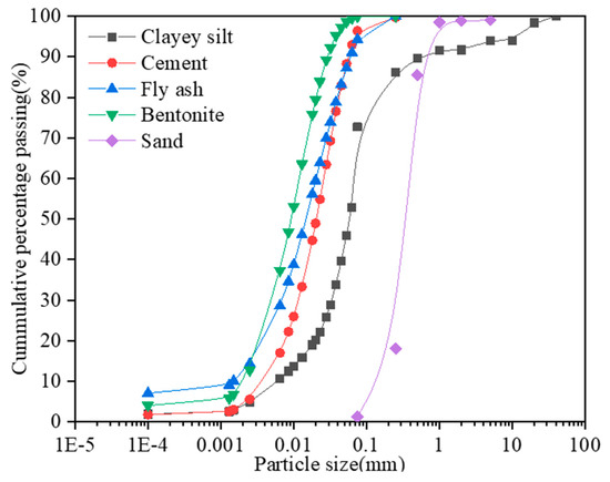 The cement used in this study was ordinary Portland cement (P.O 42.5), supplied by South Cement Company United. The fly ash used was type F in the amount of calcium oxide and level Ⅰ in fineness. The bentonite used was Na-bentonite and the number of swelling ratio was 40. The sand used was river sand between the mesh numbers of 40 to 70. All of the materials used in this paper are presented in Figure 1. The particle size distribution of these raw materials was tested by a laser particle size analyzer and a series of soil sieves, as plotted in Figure 2. The oxide composition of raw materials was analyzed by X-ray fluorescence (XRF) tests, and the results are listed in Table 1.