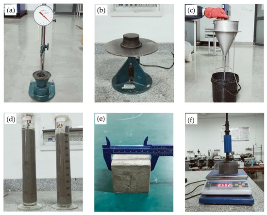 Apparatus of grouting performance test (a) consistency, (b) slump diameter, (c) grout-flow cone efflux time, (d) bleeding rate, (e) volume shrinkage rate, (f) final setting time.