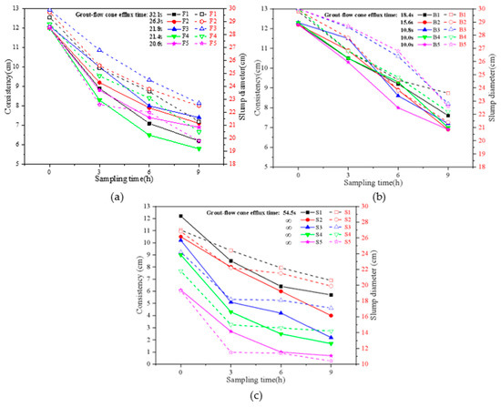 From these experimental results combined with construction experience, the flowability of grout mixes needs to meet the following three requirements: (i) the consistency is greater than 11 cm in 0 h and greater than 7 cm in 9 h; (ii) the slump diameter is greater than 27 cm in 0 h and greater than 22 cm in 9 h; (iii) the grout-flow cone efflux time is less than 60 seconds.