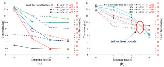 Figure 6 shows the flowability after adjusting the mix proportion of materials on the basis of replacing sand with clayey silt totally. The flowability was significantly improved with the increase of water addition due to the increase of the water:powder ratio, as Figure 6a shows. The grout-flow cone efflux time of AF1 to AF4 decreased from ‘∞’ to 12.1 s. The consistency (0 h) increased from 6.5 cm to 12.3 cm, and the consistency (9 h) increased from 5.9 cm to 10.0 cm. The slump diameter (0 h) increased from 22.7 cm to 29.2 cm, and the slump diameter (9 h) increased from 21.2 cm to 26.3 cm. Both AF3 and AF4 could meet the requirements of flowability.