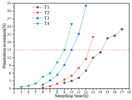 Both the final setting time and the UCS (unconfined compressive strength) can be used to express the process of strength formation. The final setting time reflects short-term strength within 24 hours, while the UCS reflects long-term strength after 24 hours. Figure 7, Figure 8 and Figure 9 show the processes of penetration resistance with increasing time, which had similar change rules with flowability, as Figure 4, Figure 5 and Figure 6 show. For example, the growth of penetration resistance had no obvious correlation with the increasing substitution ratio of clayey silt to fly ash or bentonite within 9 hours, as shown in Figure 8a,b, which had similar rules to those in Figure 5a,b. The inflection points of the strength formation curve appeared about 6 hours later after mixing, as shown in Figure 9b, which were consistent with the previous explanation about the phenomenon that flowability starts to reverse after 6 hours, as Figure 6b shows.
