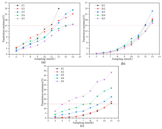 Penetration resistance of grout mix during curing time when clayey silt was reused in traditional materials. (a) Substitute for fly ash, (b) substitute for bentonite, (c) substitute for sand.