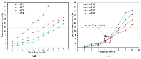Penetration resistance after adjusting the ratio of materials during curing time. (a) Adjusting the proportion of water, (b) adjusting the ratio of cement and fly ash.
