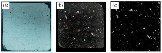 Images of sections of specimen S5. (a) Image of initial section, (b) image of treated section, (c) image after binary conversion.