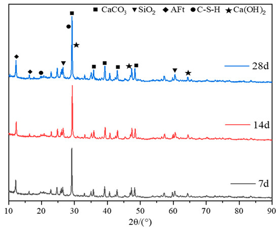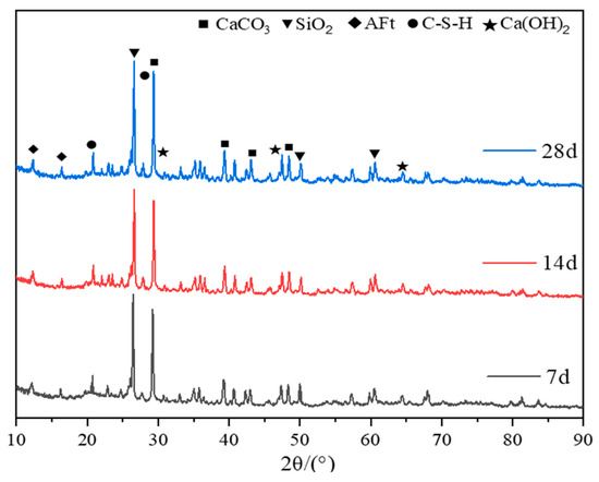 The hydration products of two typical specimens (T2 and S5) were analyzed by X-ray diffraction combined with the software MDI Jade 6.0 in order to better understand the changes of grout mix after clayey silt was reused as substitute for sand. As shown in Figure 12 and Figure 13, CaCO3, SiO2, Aft (ettringite), C–S–H and Ca(OH)2 were found in the stone body of grouts. Reaction products under the proportion of T2 and S5 were similar except for SiO2 during different curing times, which had certain extent effects on the strength [51]. The peaks of SiO2 were more obvious in specimen S5 than T2, which could be explained from the perspective of particle size. The aggregate was sand in T2 and clayey silt in S5. From the results of XRF, the content of SiO2 in sand and clayey silt was 69.11% and 65.35%, respectively, which were close, but the particle size of clayey silt was smaller than sand. The particles of sand were easily covered by other materials due to the smaller specific area than clayey silt after being mixed with other materials, making it hard to be detected by the machine. It could be observed that the content of C–S–H gel increased while Ca(OH)2 decreased during curing time, which was due to the reaction of sodium silicate with Ca(OH)2 and formation of C–S–H gel, which was an important source of strength.
