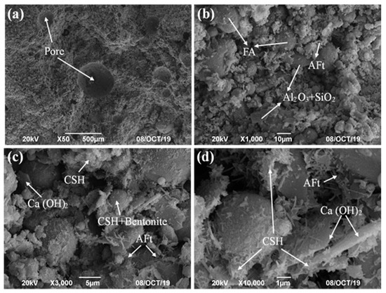 SEM photos of 28-day hardened grouts (T2): (a) 500 μm, (b) 10 μm, (c) 5 μm, (d) 1 μm.
