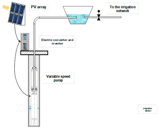 The system is composed of a photovoltaic array, a frequency converter, a variable speed pump and an elevated tank or reservoir that stores water with enough elevation to distribute it to the irrigation system. A scheme of the PV pumping system analyzed in this work is illustrated in Figure 1.