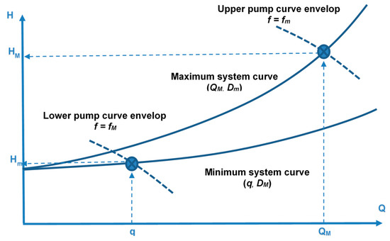 Extreme maximum and minimum system curves are defined for the maximum pumped flow (QM) and continuous flow (q), respectively. These curves were computed by applying Equations (3) and (4). Two extreme operating points, (QM, HM) and (q, Hm), are thus defined. These points are used to limit the range of admissible pumps. Admissible pumps are those whose performance curves lie within two envelopes. The upper envelope requires that the performance H-Q curve of the pump falls below the maximum operating point with the pump operating at the minimum frequency (rotating speed). Pumps above this limit would produce operating points far beyond the upper limit. The lower envelope requires that the pump curve falls above the lower operating point operating at its maximum speed. Pumps with H-Q curves below this limit are clearly unable to supply the flow and energy demands.