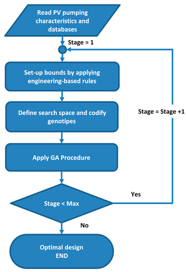 A multistage bounded genetic algorithm module was applied to optimize the design of the PV pumping system. The GA algorithm developed in this work is based on the GENOME (University of Almería, Almería, Spain) software model developed by Reca and Martínez [35], which was later converted in B-GENOME [28], an improved bounded version of GENOME that was applied to optimize the cost of a pipe network. This code was modified and adapted with the aim of optimizing the above-mentioned PV pumping design problem (BPV-GENOME). The latter model was developed using the VBA programming language and embedded in an EXCEL© (Microsoft Corporation, Redmond, Washington, EE.UU) workbook.